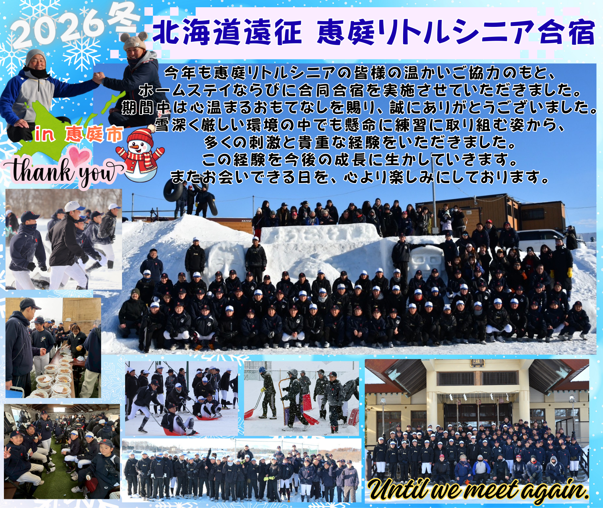 | 土・日・祝日の練習は基本8:00~17:00頃迄 (解散時間は都度連絡) ナイター練習は水曜 19:00~21:30 別処山B球場 木曜 19:30~21:30 別処山B球場 ※2月17日より火曜・木曜 19:00~21:00 砂ヶ原G (内容によりナイター練習の変更あり) 遠征の集合時間はその都度連絡 12月・1月は強化練習期間のためOP戦は行いません |