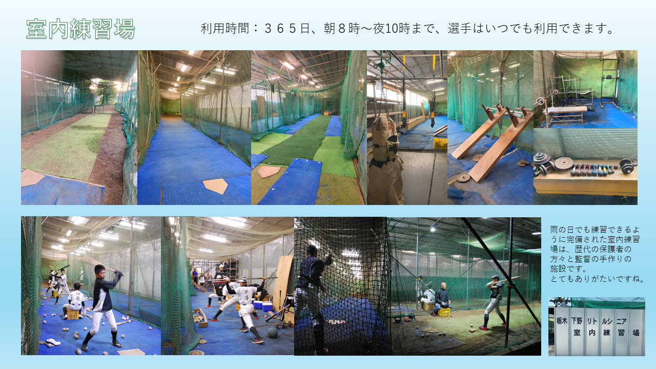 | 土・日・祝日の練習は基本8:00~17:00頃迄 (解散時間は都度連絡) ナイター練習は水曜 19:00~21:30 別処山B球場 (内容によりナイター練習の変更あり) 遠征の集合時間は都度連絡 12月・1月は強化練習期間のためOP戦は行いません |