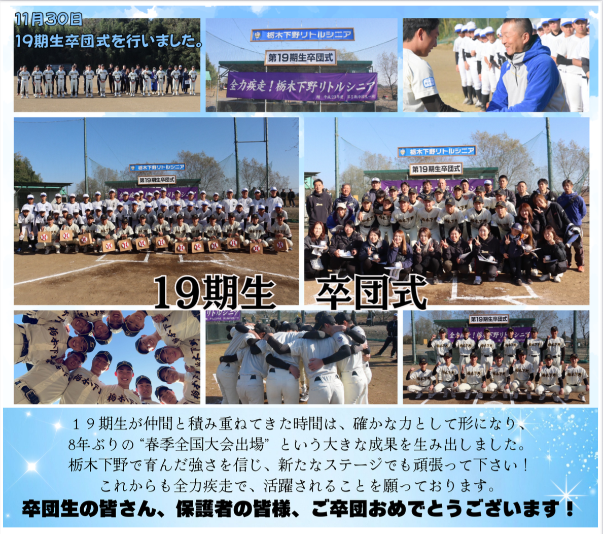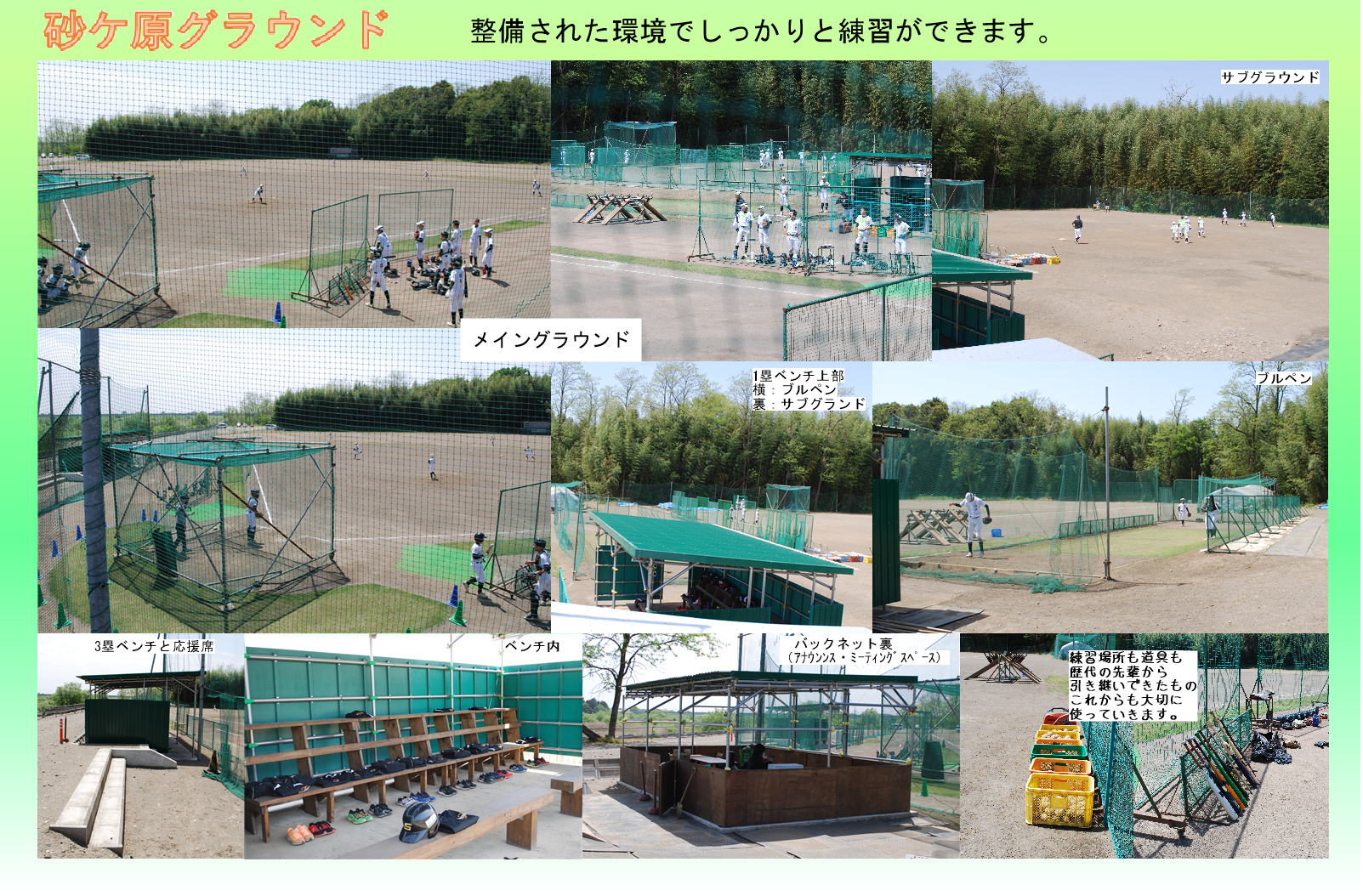 | 土・日・祝日の練習は基本8:00~17:00頃迄 (解散時間は都度連絡) ナイター練習は水曜 19:00~21:30 別処山B球場 (内容によりナイター練習の変更あり) 遠征の集合時間は都度連絡 12月・1月は強化練習期間のためOP戦は行いません |